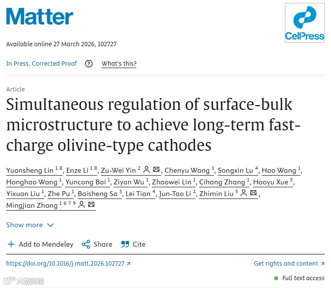Lin et al., Simultaneous regulation of surface-bulk microstructure to achieve long-term fast-charge olivine-type cathodes, Matter (2026),