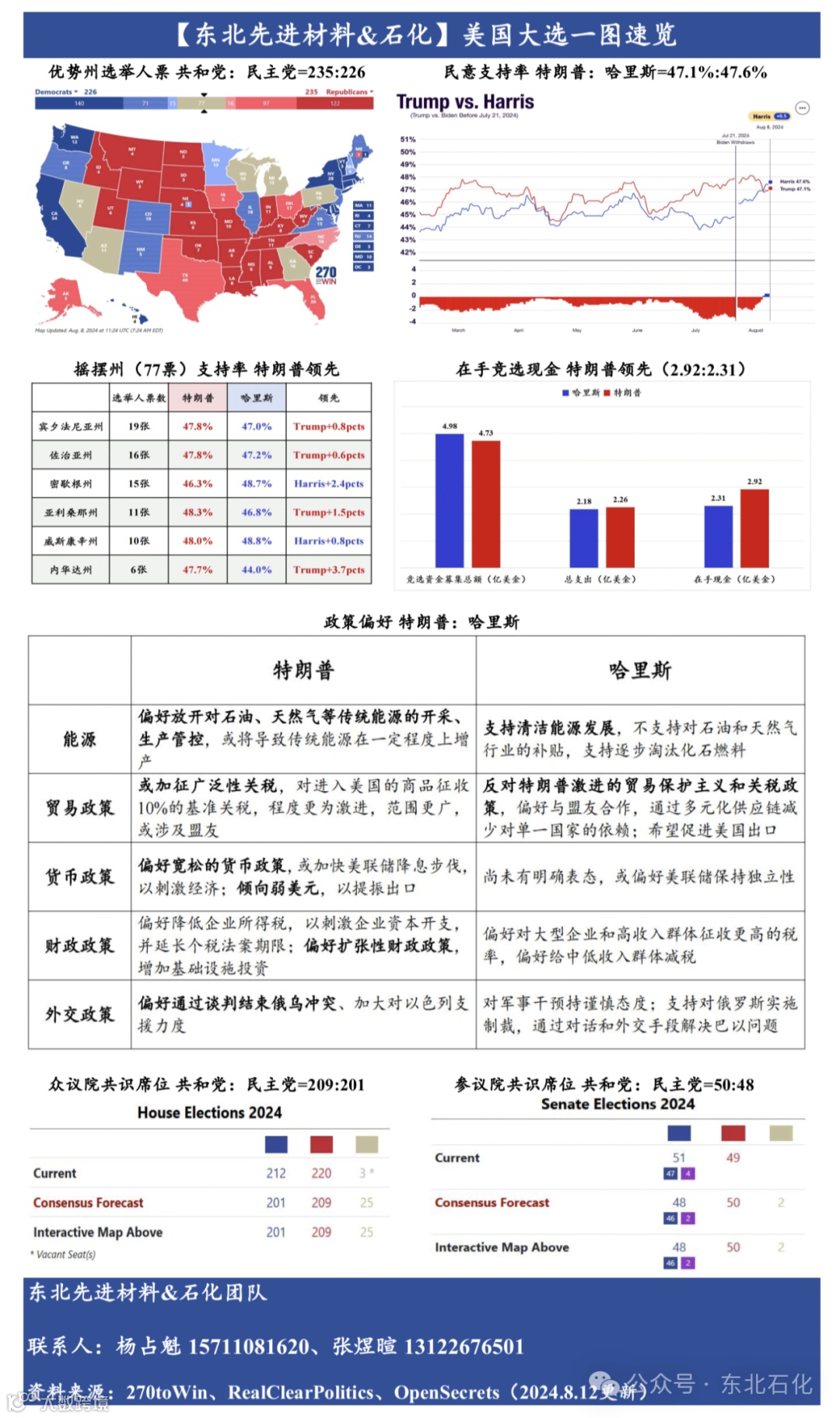民调支持率:据Real Clear Politics,截至8月12日,特朗普:哈里斯=47.1%:47.6%,哈里斯暂时领先;