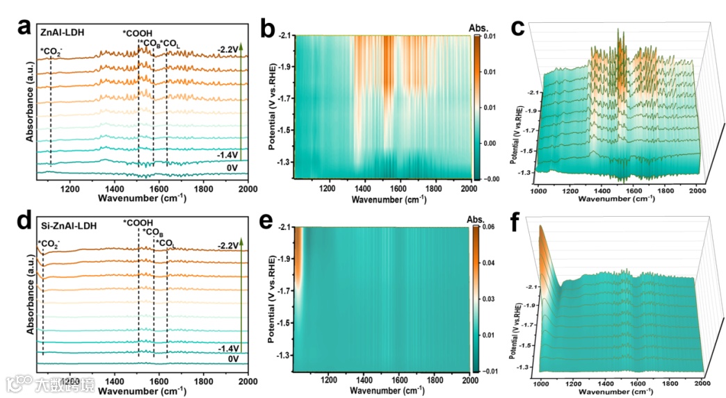 图4.(a-c) ZnAl-LDH的原位红外图,(d-f) Si-ZnAl-LDH的原位红外图。