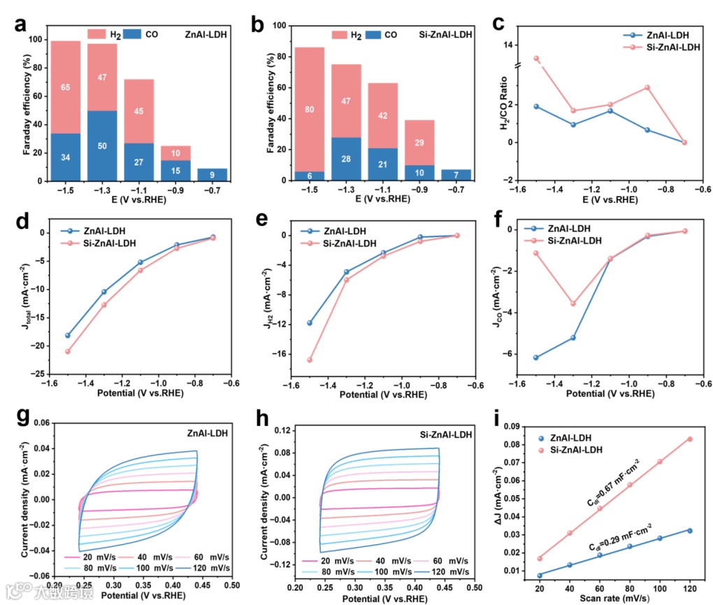 图3.(a,b) ZnAl-LDH和Si-ZnAl-LDH的电催化CO2还原性能图,(c) H2/CO产率比例图,(d) 电流密度图,(e) H2分电流密度图,(f) CO分电流密度图,(g,h ) 不同扫速下的CV曲线图,(i)双层电容图。