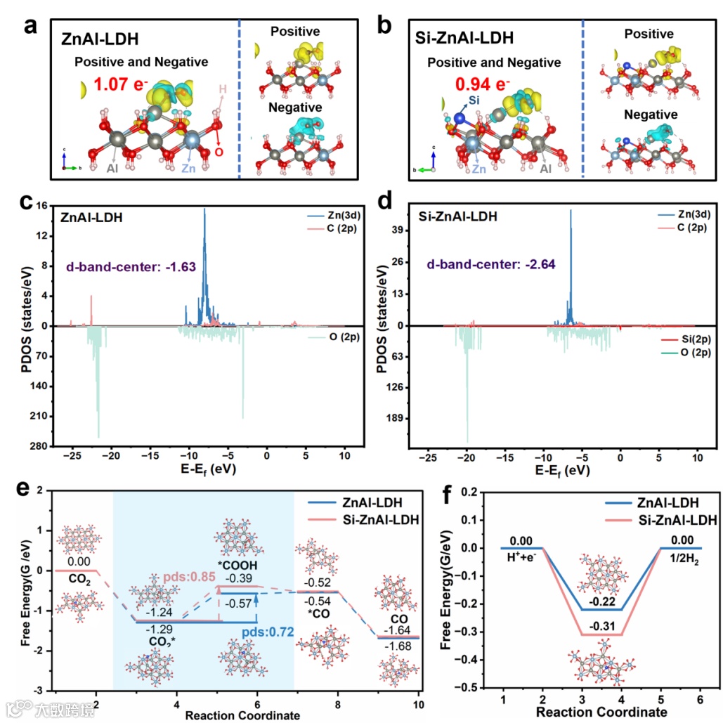 图5. (a,b) ZnAl-LDH和Si-ZnAl-LDH的差分电荷密度图,(c,d) PDOS图,(e) CO生成的吉布斯自由能图,(f) HER吉布斯自由能图。
