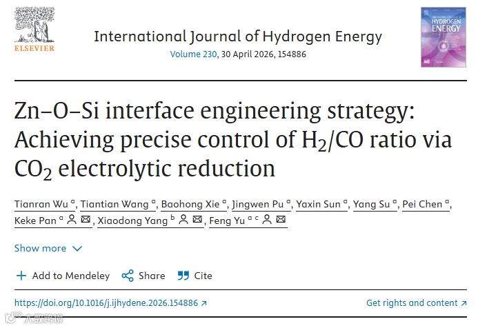 石河子大学于锋教授团队在这一领域取得重要突破:开发了富含Zn-O-Si键的Si-ZnAl-LDH催化剂,通过调控Zn-O-Si键平衡*COOH和*H的吸附强度,可以抑制CO的生成和促进H2的产生,从而实现宽比例H2/CO合成气的制备。相关工作以“Zn-O-Si interface engineering strategy: Achieving precise control of H2/CO ratio via CO2 electrolytic reduction (DOI:10.1016/j.ijhydene.2026.154886)”为题,在International Journal of Hydrogen Energy上发表。该论文的第一作者为石河子大学化学化工学院硕士研究生吴天然,通讯作者于锋教授、杨晓东副教授、潘珂珂副教授。