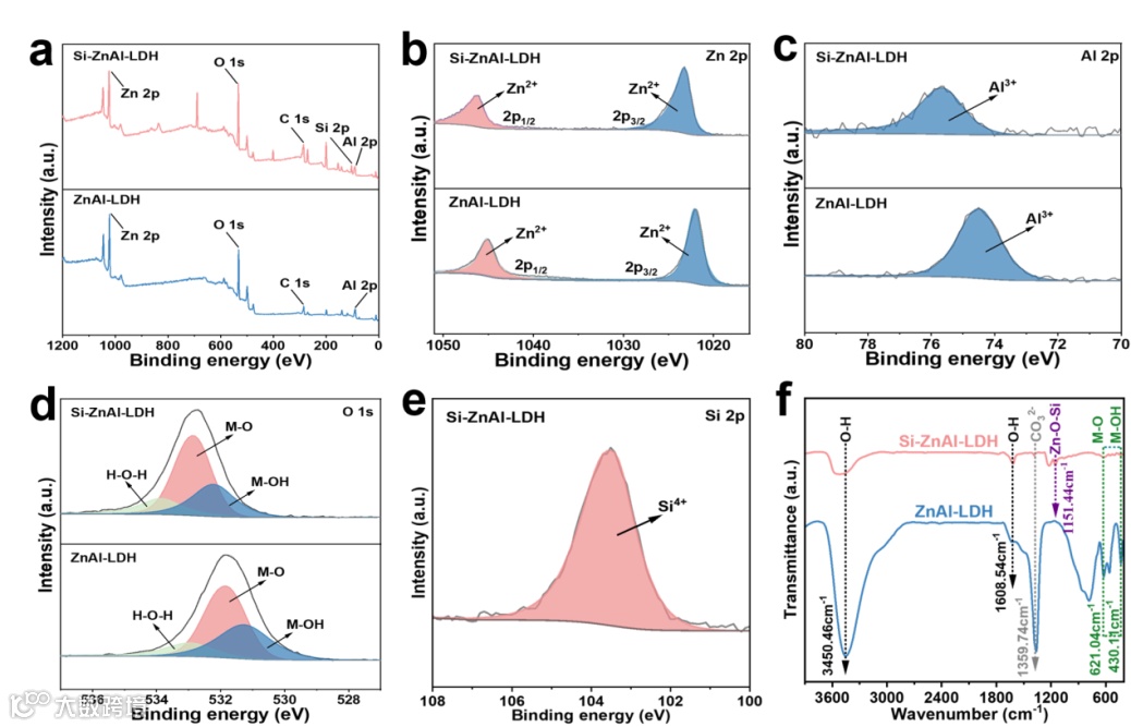 图2.(a) XPS总能谱图,(b) Zn2p,(c) Al2p,(d) O1s,(e) Si-ZnAl-LDH的Si 2p,(f) 红外图。