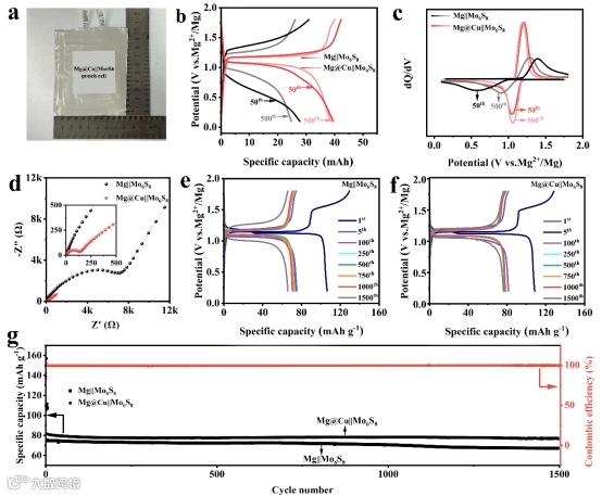 图5. (a) Mg@Cu||Mo₆S₈ 软包电池的照片。(b) Mg||Mo₆S₈ 和 Mg@Cu||Mo₆S₈ 软包电池在1 C下的电压-容量曲线 及 (c) 相应的 dQ/dV 图。采用轧制镁和Mg@Cu负极的Mo₆S₈基扣式全电池的电化学性能:(d) 电化学阻抗谱曲线;1 C下的恒流充放电曲线:(e) Mg||Mo₆S₈ 和 (f) Mg@Cu||Mo₆S₈ 电池;(g) 1 C下的长期循环性能及库仑效率。