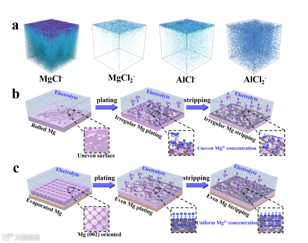 图4. (a) 循环后Mg@Cu电极表面二次离子碎片的TOF-SIMS三维重构。(b, c) 轧制镁和Mg@Cu负极上Mg²⁺通量分布及镁沉积/剥离过程的示意图。