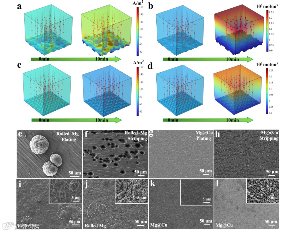 图3. 利用COMSOL Multiphysics软件进行的相场模拟:(a, b) 轧制镁电极和 (c, d) Mg@Cu 电极的 (a, c) 电场分布 和 (b, d) Mg²⁺ 通量分布。轧制镁和Mg@Cu负极的沉积/剥离形貌:轧制镁在 (e) 首次沉积后 和 (f) 首次剥离后的扫描电镜图像;(i) 10次循环后的沉积 和 (j) 剥离形貌。Mg@Cu在 (g) 首次沉积后 和 (h) 首次剥离后的扫描电镜图像;(k) 10次循环后的沉积 和 (l) 剥离形貌。