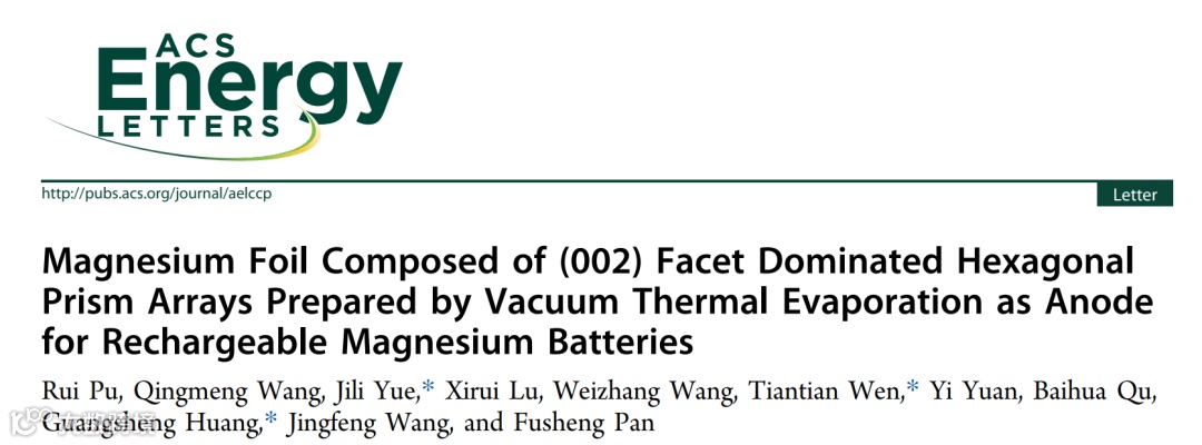 近日,重庆大学潘复生院士团队提出采用真空热蒸发(VTE)技术在铜基底上直接沉积制备超薄镁箔(Mg@Cu,镁厚度约10 μm)。该方法利用真空条件下镁的升华-沉积行为,通过固-气-固(SVS)机制生长出以(002)晶面为主导的、均匀分布的六方柱阵列结构。实验表明,该(002)晶面优先取向的镁负极具有优异的电解液润湿性(接触角22.83° vs. 轧制镁45.72°)和极低的界面能(与Cu(220)的界面能仅1.01 J·m⁻²)。基于Mg@Cu的对称电池在2 mA cm⁻²、2 mAh cm⁻²的严苛条件下(镁利用率高达52%)可稳定循环超过1000 h,极化仅约150 mV。进一步组装Mg@Cu||Mo₆S₈全电池,在1 C下循环1500圈后仍保持76.6 mAh g⁻¹的比容量,优于轧制镁负极(67.2 mAh g⁻¹)。此外,该VTE方法可实现大面积(12 cm × 18 cm)镁箔的制备,并在软包电池中展现出显著降低的极化(~160 mV vs. 轧制镁软包~411 mV)。该工作为超薄镁负极的规模化制备提供了新思路,相关研究成果以Magnesium Foil Composed of (002) Facet Dominated Hexagonal Prism Arrays Prepared by Vacuum Thermal Evaporation as Anode for Rechargeable Magnesium Batteries 为题发表于国际顶级期刊ACS Energy Letters。