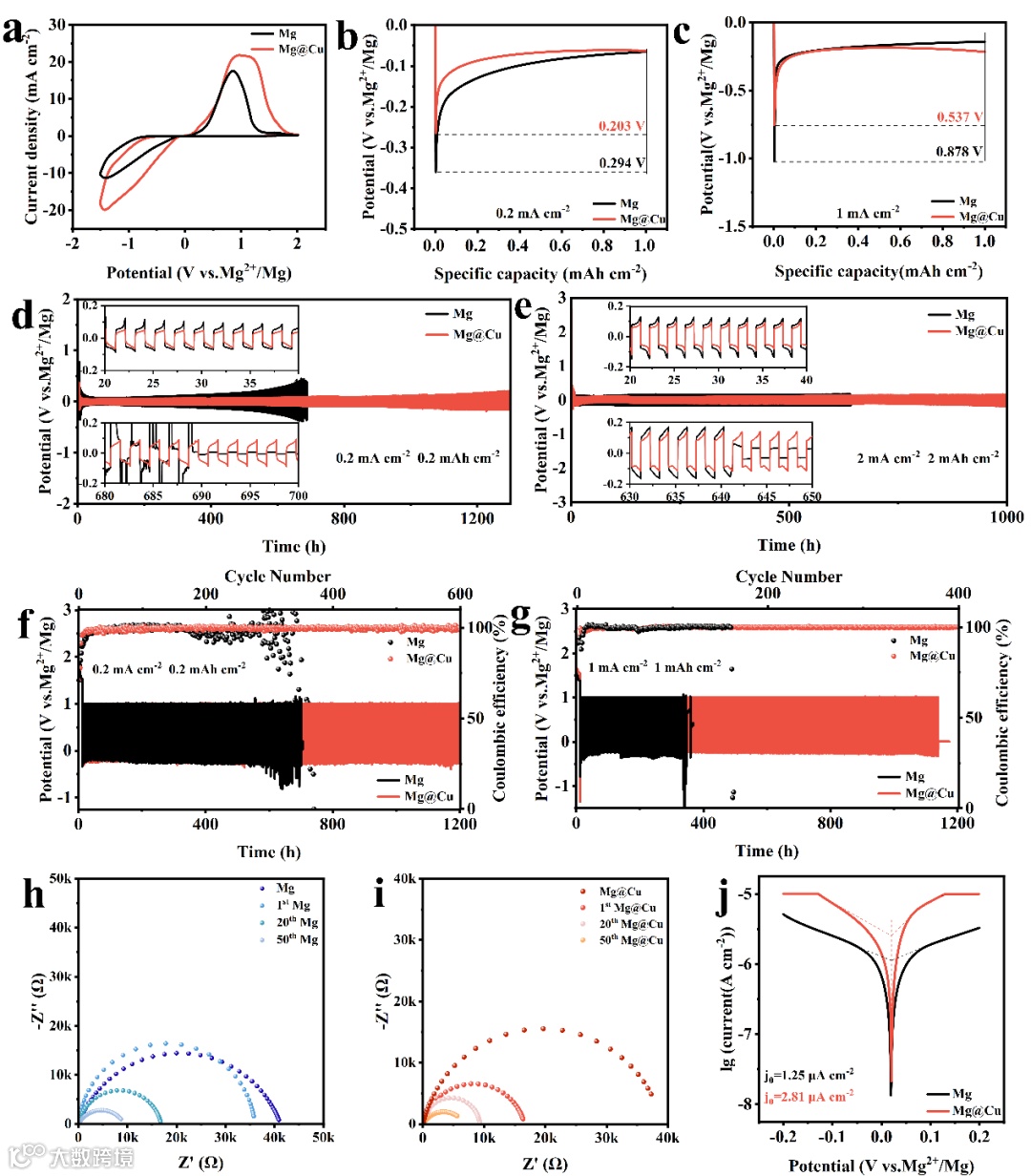 图2. 轧制镁负极与Mg@Cu负极的电化学性能:(a) 循环伏安曲线。轧制镁和Mg@Cu在 (b) 0.2 mA cm⁻² 和 (c) 1 mA cm⁻² 下的成核过电位。采用轧制镁负极和Mg@Cu负极的Mg||Mg对称电池在 (d) 0.2 mA cm⁻²、0.2 mAh cm⁻² 和 (e) 2 mA cm⁻²、2 mAh cm⁻² 下的循环性能。(f) Mg||Cu 和 (g) Mg@Cu||Cu 非对称电池的库仑效率。(h) Mg||Mg 和 (i) Mg@Cu||Mg@Cu 对称电池的奈奎斯特图。(j) Mg||Mg 和 Mg@Cu||Mg@Cu 对称电池的塔菲尔曲线。