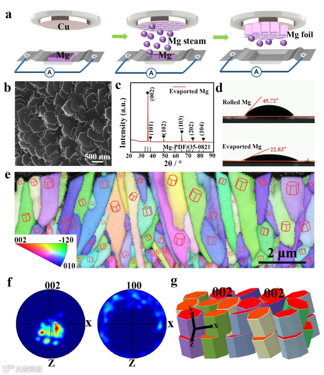 图1. (a) 真空热蒸发制备超薄镁箔的流程示意图。(b) 蒸发态镁箔的扫描电镜图像。(c) 蒸发态镁箔的X射线衍射图谱。(d) APC电解液在轧制镁负极和蒸发态镁负极上的接触角。(e) 蒸发态镁横截面的EBSD取向图。(f) 蒸发态镁横截面的极图。(g) 蒸发态镁的取向示意图。