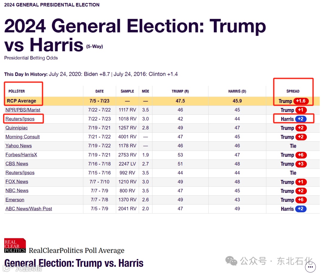 7月23日,路透社/益普索的最新一轮民调结果显示哈里斯领先约2pcts;
