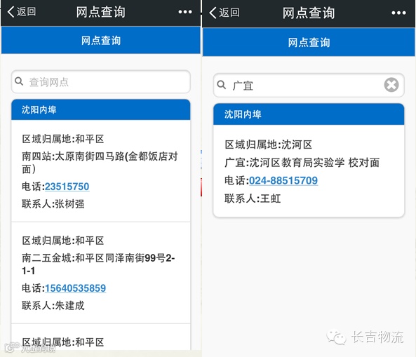 网点查询:包含了长吉现有的所有网点。网点按照行政区域进行划分,可以在放大镜处搜索想要查询的网点名称、行政区域名称、关键字均可查询到相关信息。