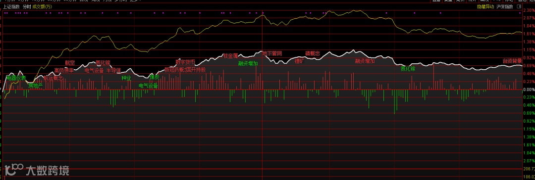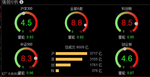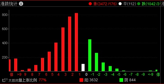 此外农业、化肥、房地产、装修建材等板块轮番活跃,个股呈现普涨态势,两市近3500股飘红,超150股涨停,今日成交达9009亿元。