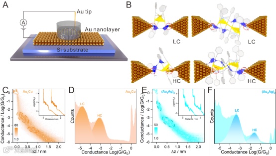 正如前文所述,单个原子从铜(Cu)变为银(Ag)不仅显著改变了合金团簇的结构,还对其性质产生了重大影响。为了更深入地理解它们在性质上的差异,我们尝试对比了单个团簇分子的电子传输性质。单分子电导测量技术是一种极具前景的技术,它能够定量研究单个分子的电化学行为,从而避免了集合测量中出现的平均效应。