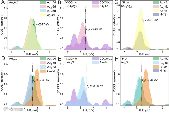 此外,作者还研究了这两种纳米团簇的竞争性析氢反应催化活性(图5B)。对于Au3Cu纳米团簇,竞争性析氢反应决速步的吉布斯自由能为1.45 eV,仅比二氧化碳还原反应的决速步吉布斯自由能(1.43 eV)高0.02 eV,这表明该纳米团簇对电催化二氧化碳还原反应的选择性较差。对于(Au3Ag)2纳米团簇,我们的计算表明,H+ * + e- →*H 的吉布斯自由能变化(1.55 eV)比* CO2 → *COOH 的吉布斯自由能变化(1.26 eV)高0.29 eV,这表明(Au3Ag)2二聚体更有利于二氧化碳电还原为一氧化碳,且与Au3Cu相比具有更高的选择性。同时投影态密度(PDOS)以及与HER和eCO2RR中关键中间体相关的d带中心(εd)研究结果表明(如图 6),通过单原子取代(Cu→Ag)引发的纳米簇二聚现象,能够通过精确调控d带中心位置,对电催化二氧化碳还原反应(eCO2RR)和竞争反应HER的选择性实现差异化控制。