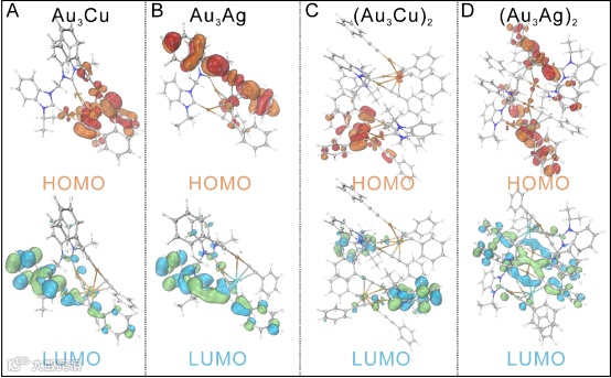 图2 (A) Au3Cu、(B) Au3Ag、(C) (Au3Cu)2 和(D) (Au3Ag)2 的最高占据分子轨道(HOMO)和最低未占据分子轨道(LUMO)的可视化。