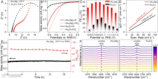 图4 Au3Cu和(Au3Ag)2在电催化CO2还原反应中的研究。