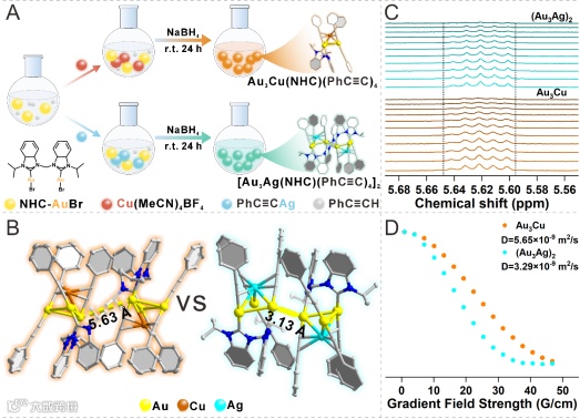 图1单体Au3Cu和二聚体(Au3Ag)2的合成、分子结构及DOSY分析。
