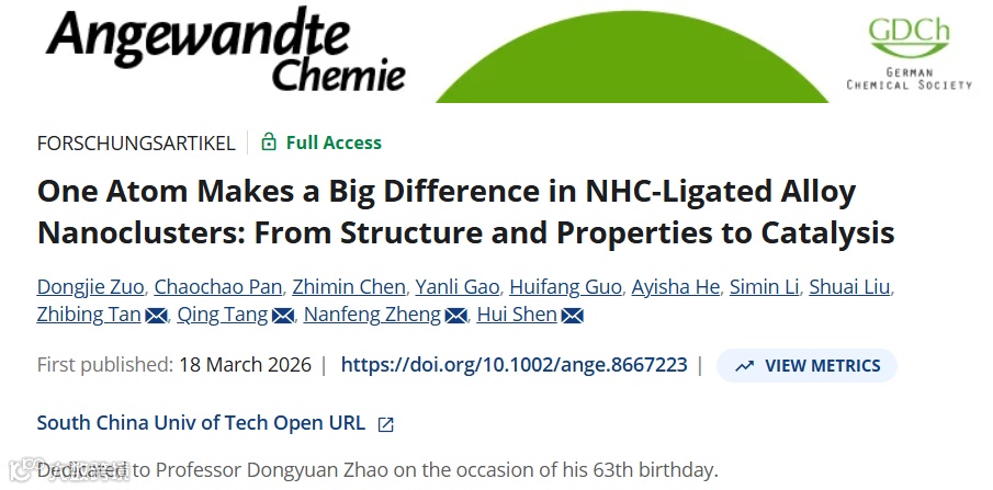 近日,厦门大学郑南峰院士团队、内蒙古大学沈慧和谭志冰团队、重庆大学唐青团队通力合作,在氮杂环卡宾稳定的金属纳米团簇取得进展。相关成果以“One Atom Makes a Big Difference in NHC-Ligated Alloy Nanoclusters: From Structure and Properties to Catalysis”为题,发表于Angewandte Chemie International Edition