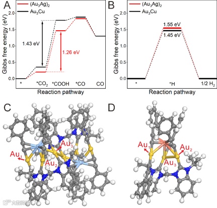 图5(A、B)在零外加电势下,(Au3Ag)2和Au3Cu上CO2电还原为CO(A)及竞争反应析氢反应(HER)(B)的自由能图。(C、D)(Au3Ag)2和Au3Cu的优化结构及相应的原子标记。
