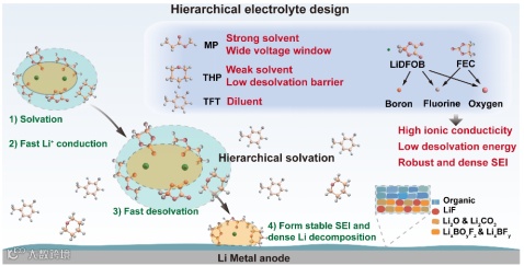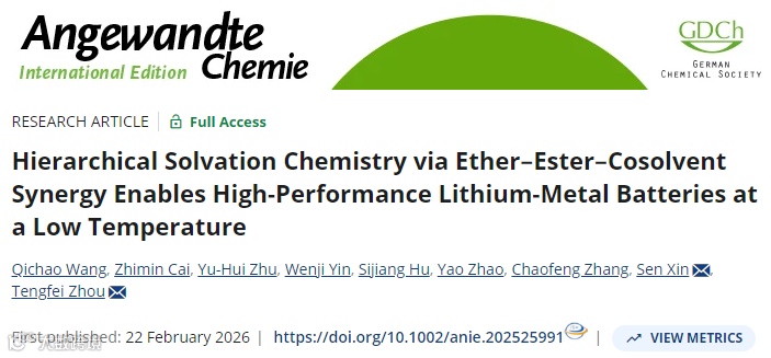 电气化交通、航空航天及国防领域对高性能储能系统的迫切需求推动了锂金属电池(LMBs)的快速发展。锂金属电池因其理论比容量而备受关注。然而,在低温与高功率工况下,传统碳酸盐电解液因Li⁺去溶剂化动力学迟缓、离子传输活化能过高,导致容量大幅衰减,严重制约了LMBs在极端环境中的实际应用。可行的低温电解液必须同时满足三项核心要求:高的离子电导率、低的Li⁺去溶剂化活化能,以及与氧化性正极和还原性负极兼容的宽电化学稳定窗口。传统电解液体系普遍难以在深冷条件下满足这些协同要求,成为制约产业应用的关键瓶颈。