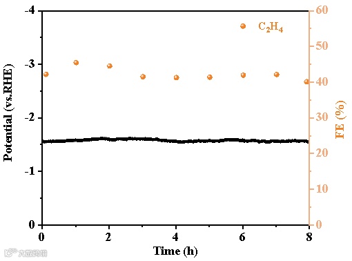 测试条件: 通过MFC稳定控制CO2气体入口流速,采用辰华1140C大功率电化学工作站,在恒电流下长时间运行,并每隔一段时间采集气相或液相产物,得到电压-时间关系曲线和对应时间的气相产物法拉第效率。