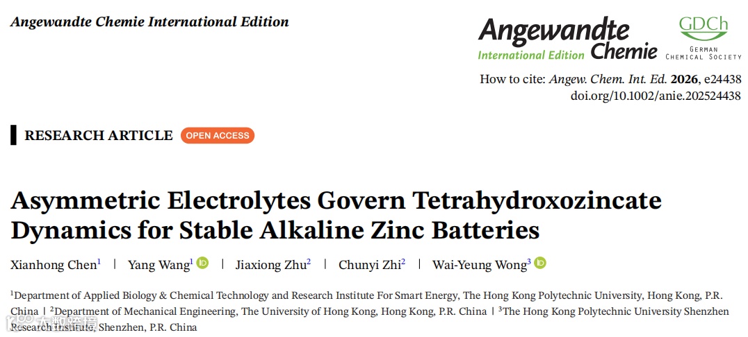 近日,来自香港理工大学的黄维扬、王阳与香港大学的支春义合作,在国际知名期刊Angewandte Chemie International Edition上发表题为“Asymmetric Electrolytes Govern Tetrahydroxozincate Dynamics for Stable Alkaline Zinc Batteries”的研究性文章。该文章揭示了定制化分子不对称性如何突破水系电池化学的长期挑战,为构建高性能、长寿命的储能系统提供了新路径。