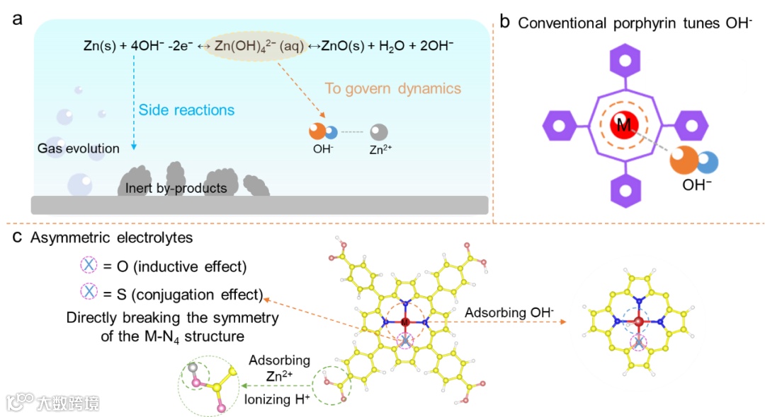 图1. (a)碱性电池面临的挑战、(b)用于调控OH-的传统卟啉结构以及(c)本工作中通过不对称卟啉结构电解质添加剂优化碱性锌电池反应动力学的示意图。