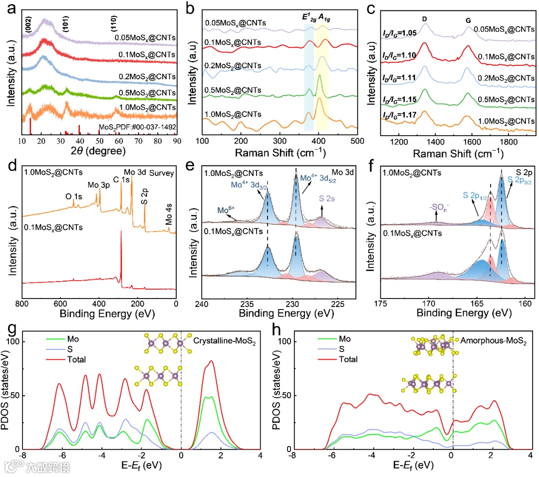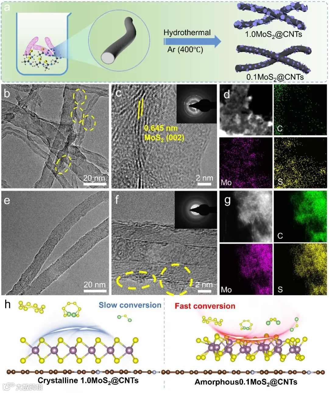 1. 原位水热调控实现无定形化设计:通过精细调节硫源与钼源前驱体的比例,在碳纳米管(CNTs)骨架上成功实现了MoS2从结晶态到无定形态的演变。由于前驱体浓度的降低限制了晶体形核位点,最终形成了短程有序但长程无序的无定形MoS2结构。