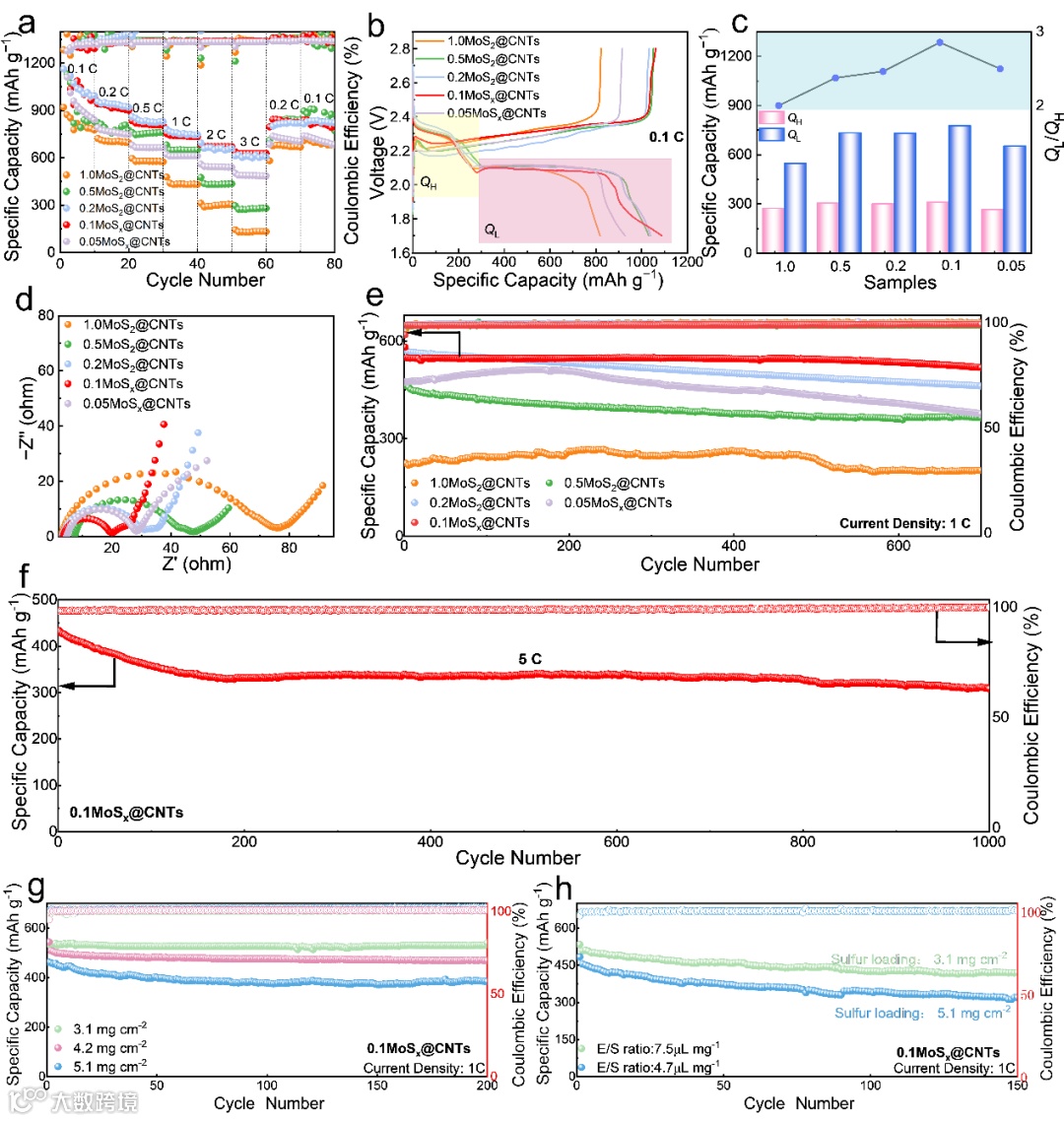 图5 对比了锂硫电池的电化学性能。0.1MoSx@CNTs 电极在不同倍率下均保持最高的放电比容量,并且具有远高于其他样品的 QL/QH 容量比,验证了其卓越的多硫化物催化转化能力。同时,在1.0C和5.0C下进行的超长循环测试,以及在高硫载量和贫电解液条件下的循环表现,充分证明了其优异的电化学稳定性。
