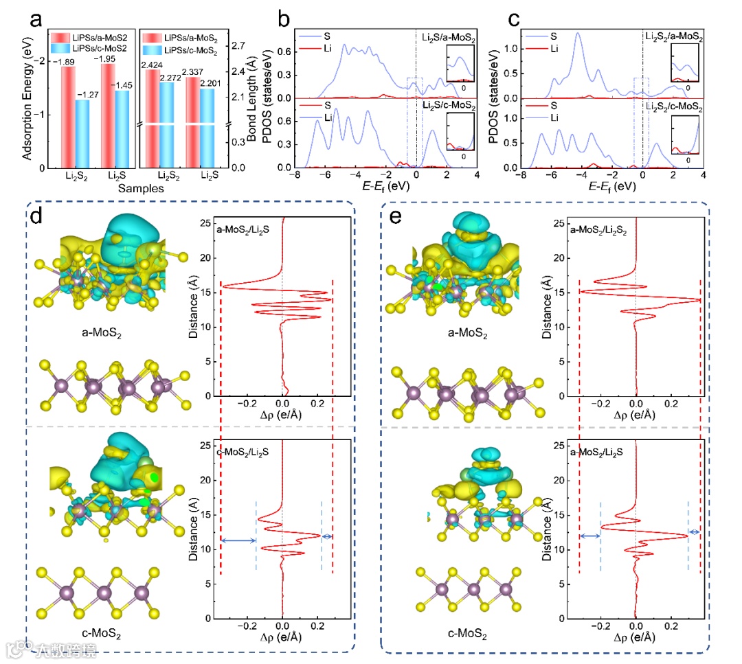 2. 电子尺度揭示无定形催化的本征机制: 结合原位表征与DFT计算,发现无定形MoS2相较于结晶态具备更高的费米能级附近电子态密度(DOS)。这种独特的电子结构促进了Li-2s与S-3p轨道间的强杂化,极大增强了电荷离域与界面电子转移,从根本上降低了多硫化物的反应能垒。