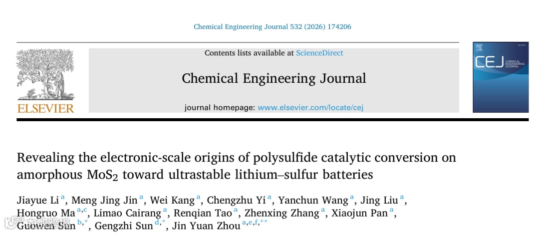 Jiayue Li, Meng Jing Jin, Wei Kang, Chengzhu Yi, Yanchun Wang, Jing Liu, Hongruo Ma, Limao Cairang, Renqian Tao, Zhenxing Zhang, Xiaojun Pan, Guowen Sun, Gengzhi Sun, Jin Yuan Zhou, Revealing the electronic-scale origins of polysulfide catalytic conversion on amorphous MoS2 toward ultrastable lithium–sulfur batteries, Chemical Engineering Journal, Volume 532, 2026, 174206, ISSN 1385-8947