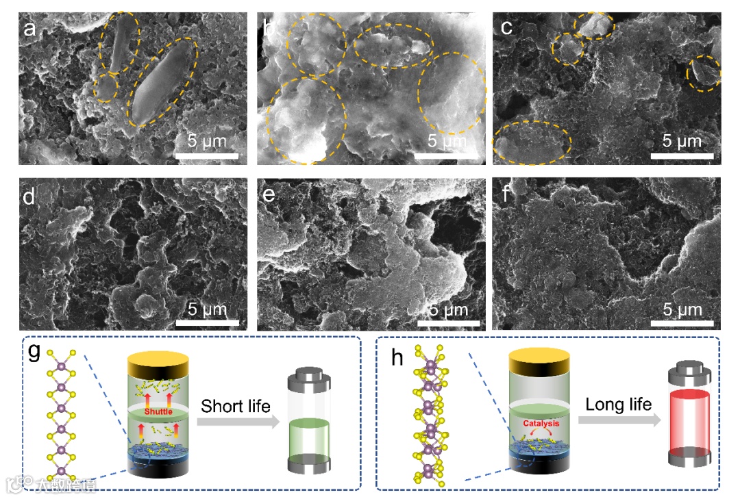 图6 进行了电池循环后的失效机制分析。SEM图像对比显示,循环后结晶态 1.0MoS2@CNTs 表面出现了巨大且不均匀的Li2S团块堆积,而无定形 0.1MoSx@CNTs 电极循环后依然保持了清晰完整的三维网络导电网络,进一步证实了无定形结构能够增强化学吸附和加速LiPSs催化转化来抑制穿梭效应,从而确保其卓越的长期稳定性。