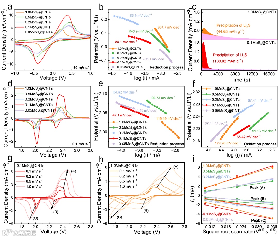 图4 通过对称电池的CV和Tafel、Li2S 沉积实验及离子扩散动力学研究,系统评估了样品的电催化活性。结果表明,0.1MoSx@CNTs 具有最高的电流响应和最小的极化斜率,证明其具备最快的LiPSs转化能力。此外,Li2S恒电位成核实验显示0.1MoSx@CNTs具备最大的成核电流和最早的成核时间,极大地促进了Li2S的均匀沉积。