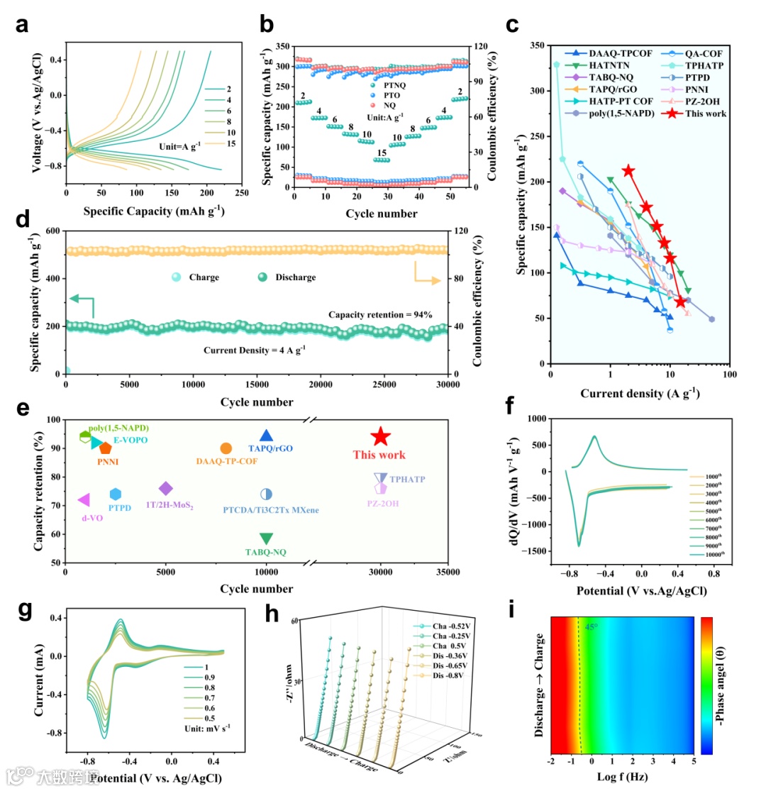 在 2 M NH₄Ac 电解液的三电极体系中,PTNQ 负极展现出远超前驱体 NQ 和 PTO 的电化学性能:2 A g⁻¹ 下放电比容量达 220.7 mA h g⁻¹,即使在 15 A g⁻¹ 的超高电流密度下,仍保持 85.9 mA h g⁻¹ 的比容量;4 A g⁻¹ 下循环 30000 次后容量保持率达 94%,平均每圈衰减仅 0.0002%,低电流密度 0.1 A g⁻¹ 下循环 50 次也能保持 94% 的初始放电容量。