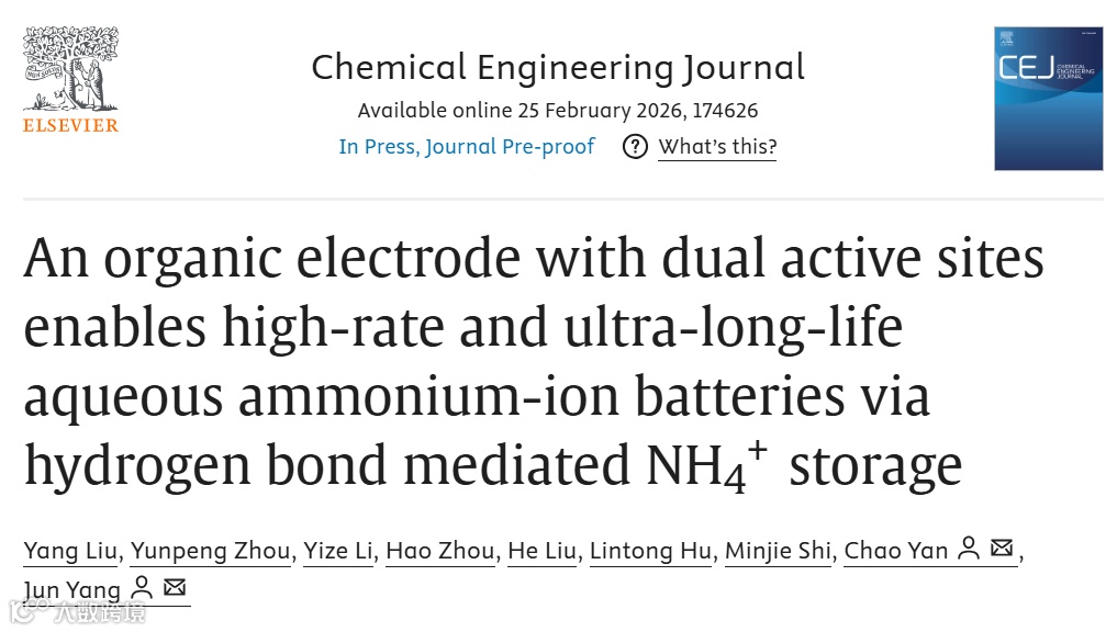 近日,江苏科技大学晏超教授、杨骏教授团队在国际顶级期刊《Chemical Engineering Journal》发表题为An organic electrode with dual active sites enables high-rate and ultra-long-life aqueous ammonium-ion batteries via hydrogen bond mediated NH₄⁺ storage的研究论文。该团队首次将具有全共轭平面结构的双活性位点芳香化合物 PTNQ 应用于 AAIBs 负极,通过 C=O 和 C=N 双活性位点与芳香骨架的协同作用,拓展了分子共轭平面,赋予材料优异的电子亲和性、结构稳定性和放电比容量。