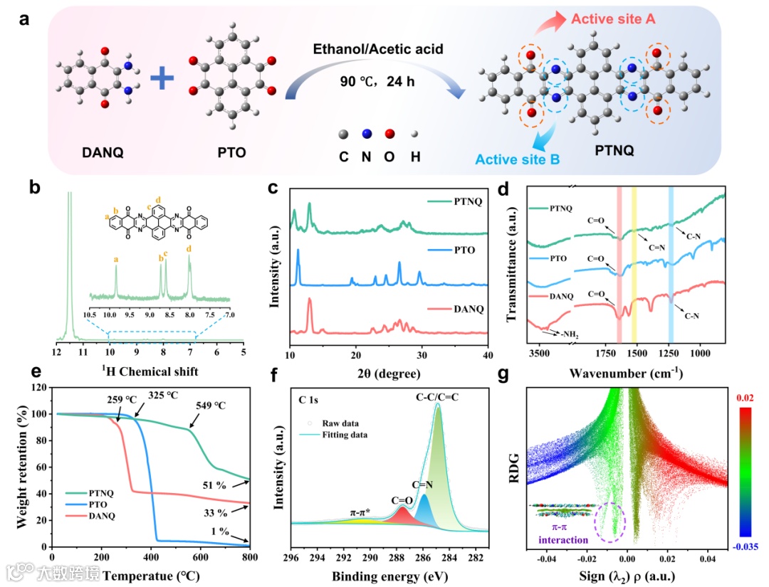 团队以 PTO 和 DANQ 为前驱体,通过溶剂热反应合成了具有 C=O 和 C=N 双活性位点的全共轭平面芳香化合物 PTNQ。结构表征表明,PTNQ 具有纤维状形貌,分子间存在 π-π 堆叠和分子内氢键作用,形成了稳定的共轭骨架;其 HOMO-LUMO 能隙仅为 2.2 eV,电子带隙窄,电子转移效率更高。