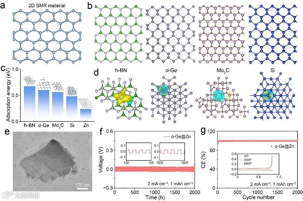 图6. (a)六元环材料的示意图。(b)硅烯、α-锗烯、六方氮化硼和二碳化钼的结构模型。(c)锌原子在不同基底上的吸附能。(d)锌原子在硅烯、α-锗烯、六方氮化硼和二碳化钼基底上的电子密度差分布图。(e) α-锗烯的透射电镜图像。(f) 基于α-锗烯修饰锌电极的Zn||Zn电池在2 mA cm−2和1 mAh cm−2电流密度下的循环性能。(g) 基于α-锗烯修饰锌电极的Zn||Cu电池在2 mA cm−2与1 mAh cm−2电流密度下的库伦效率及对应容量-电压曲线。