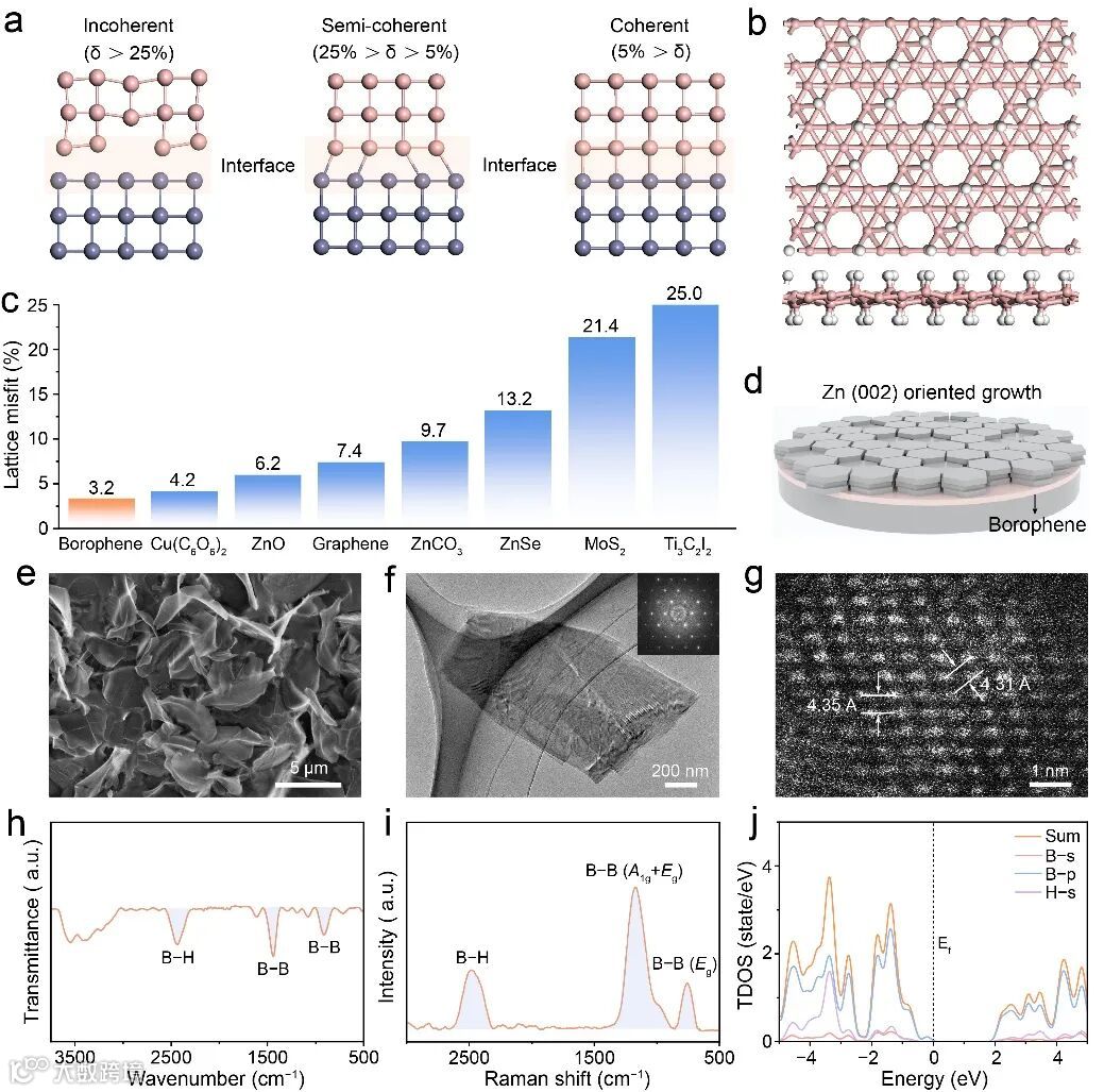 图1.(a)锌在非相干、半相干及相干界面基底上的沉积示意图。(b) αʹ-4H-硼烯的结构模型。 (c) αʹ-4H-硼烯与其他材料的晶格失配值对比。(d) 硼烯诱导锌(002)织构生长的示意图。(e) αʹ-4H-硼烯的SEM。(f) αʹ-4H-硼烯的TEM图像,插图为对应的 SAED 图谱。(g) αʹ-4H-硼烯的HAADF -STEM图像。(h) αʹ-4H-硼烯的ATR-FTIR光谱。(i) αʹ -4H-硼烯的拉曼光谱。(j) αʹ-4H-硼烯的态密度计算 。