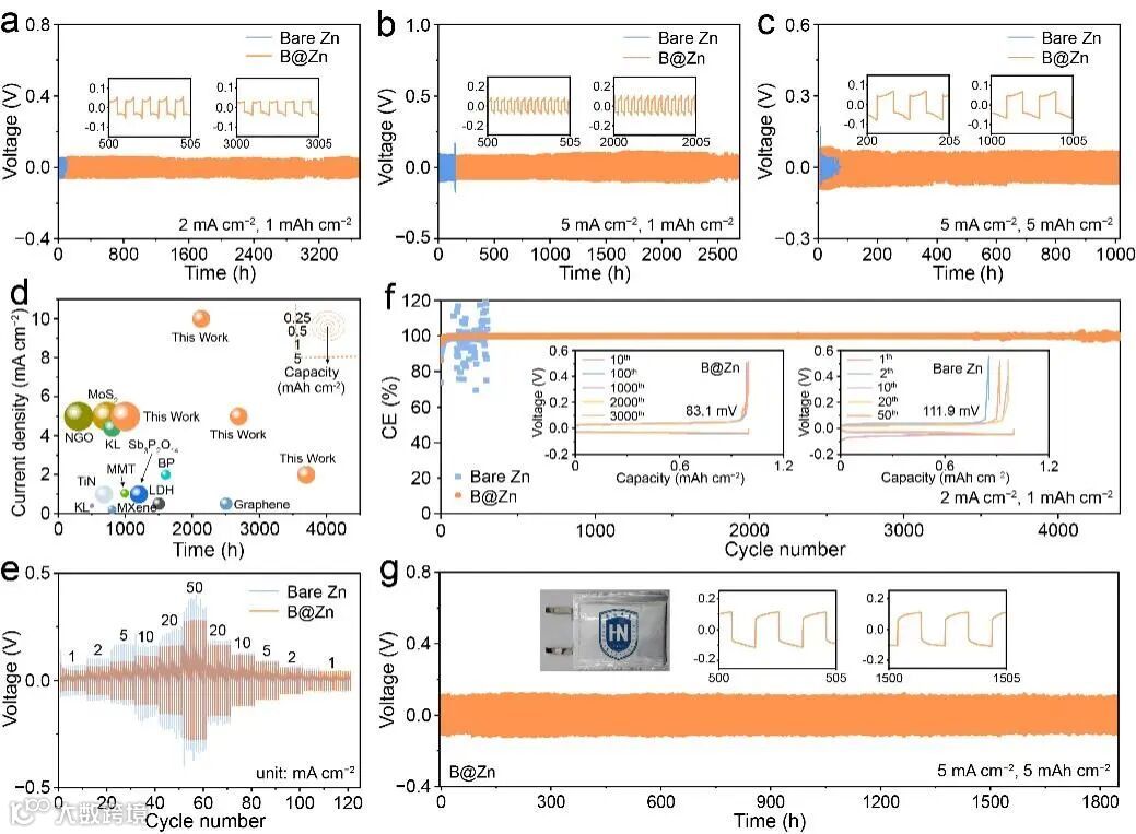 图4. (a) 采用裸Zn和B@Zn电极构建的对称电池在电流密度和容量分别为2 mA cm−2与1 mAh cm−2、5 mA cm−2与1 mAh cm−2、5 mA cm−2与5 mAh cm−2时的循环性能。(d) αʹ -4H-硼烯与已报道的二维或层状无机材料修饰Zn电极寿命对比。(e) 在固定容量1 mAh cm−2条件下,于1至50 mA cm−2电流密度范围内进行的倍率性能测试。(f) 2 mA cm−2与1 mAh cm−2电流密度下记录的库伦效率及对应容量-电压曲线。(g) B@Zn||B@Zn对称袋式电池在5 mA cm−2与5 mAh cm−2电流密度下的长循环性能,插图为软包电池数码照片及放大后的恒流曲线。
