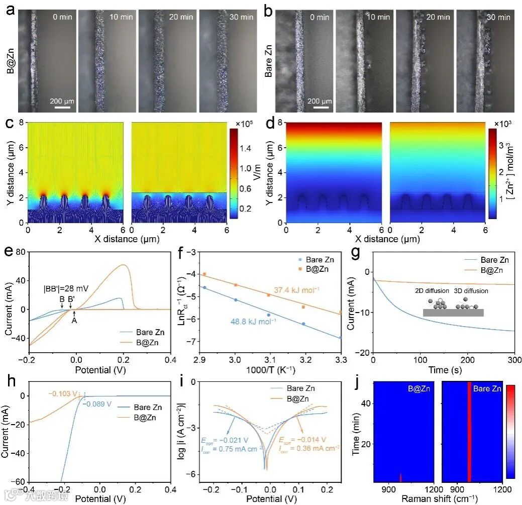 图3. 原位光学显微镜图像在5 mA cm−2电流密度下,(a) B@Zn与(b)裸Zn电极表面的锌电沉积情况。(c)裸Zn电极(图(c)和(d)左图)及(B@Zn)电极(图(c)和(d)右图)的电场分布与(Zn2+)通量 COMSOL 模拟结果。(e)以10 mV s−1扫描速率记录的循环伏安曲线。(f)根据阿伦尼乌斯方程计算的Ea值。(g)在-150 mV过电位下记录的时序电流曲线。(h)裸Zn与(B@Zn)电极的拉夫尔曲线及(T)塔菲尔曲线。(j)采用裸Zn与(B@Zn)电极构建的对称电池原位拉曼光谱图。