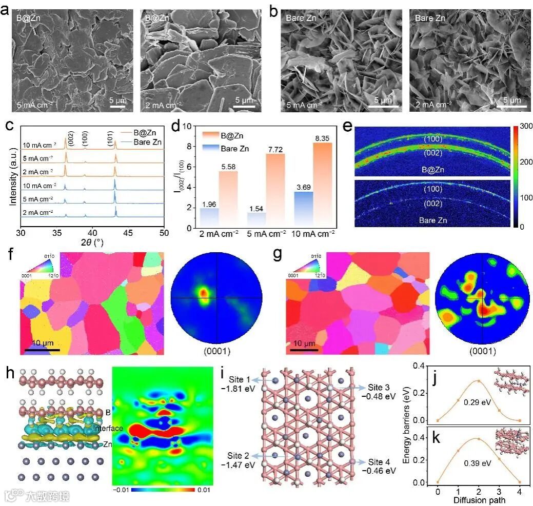 图2. (a) B@Zn与(b)裸Zn电极经过100次循环后的扫描电镜图像。(c) Zn电沉积层在不同电流密度下循环100次后的 XRD 图谱,(d)对应I(002)/I(100)比值。(e) B@Zn与裸Zn电极循环100次后Zn电沉积层的 GIWAXS 图谱。(f) 裸Zn电极上Zn电沉积层的 EBSD 映射图像及极坐标图,(g) 裸Zn与(b) B@Zn电极上Zn电沉积层的 EBSD 映射图像及极坐标图。(h) B(001)-Zn(002)界面的二维和三维差分电荷密度分布。(i) Zn原子在B(001)表面不同位点的吸附能。(j) Zn2+沿B(001)表面的扩散势垒,(k) B(001)晶面的扩散势垒。