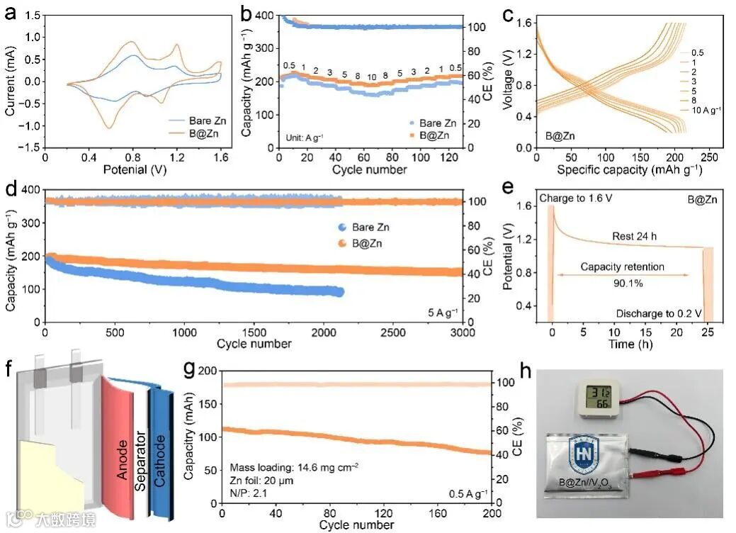 图5. (a) 在0.5 mV s−1条件下记录的B@Zn||V2O3和裸Zn||V2O3电池的CV曲线。(b) B@Zn||V2O3和裸Zn||V2O3电池的倍率性能。(c) B@Zn||V2O3电池的电压-容量曲线。(d) B@Zn||V2O3和裸Zn||V2O3电池在5 A g−1电流密度下的长期循环稳定性。(e) 对B@Zn||V2O3电池进行的自放电测试。(f) B@Zn||V2O3 软包电池的示意图。(g) B@Zn||V2O3 pouch电池在低N/P比2.1下的循环性能。(h) 由B@Zn||V2O3 软包电池供电的温度计的数码照片。
