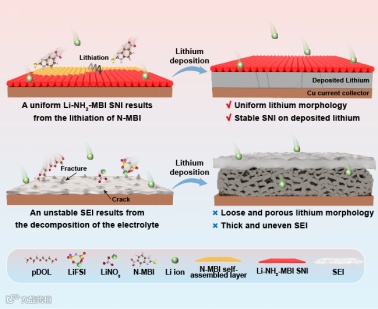 与传统牺牲型添加剂需要多次循环才能建立SEI不同,N-MBI通过分子自组装在锂沉积前即在铜集流体表面形成有序保护层: