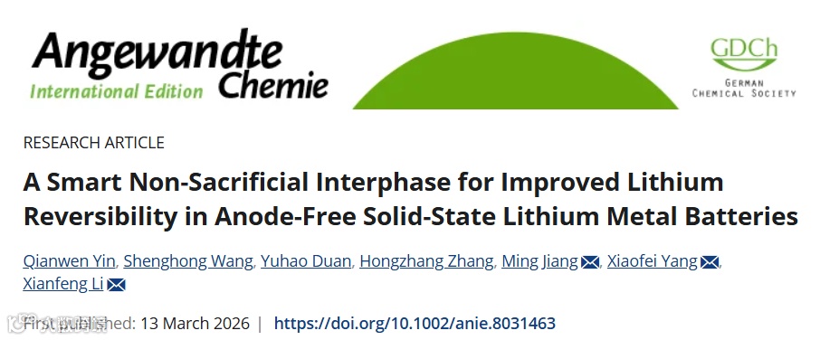 近日,中国科学院大连化学物理研究所李先锋研究员、杨晓飞研究员与安徽大学姜明老师合作,在国际知名期刊Angewandte Chemie International Edition上发表题为"A Smart Non-Sacrificial Interphase for Improved Lithium Reversibility in Anode-Free Solid-State Lithium Metal Batteries"的研究论文。该工作提出了"智能非牺牲界面"(Smart Non-Sacrificial Interphase, SNI)新概念,选用5-硝基-2-巯基苯并咪唑(N-MBI)作为电解液添加剂,利用其自适应状态转变特性(沉积前自组装-沉积时原位转化-循环中持久保护),构建了超薄且功能持久的分子级界面层,显著提升了无负极电池的锂可逆性和循环寿命。