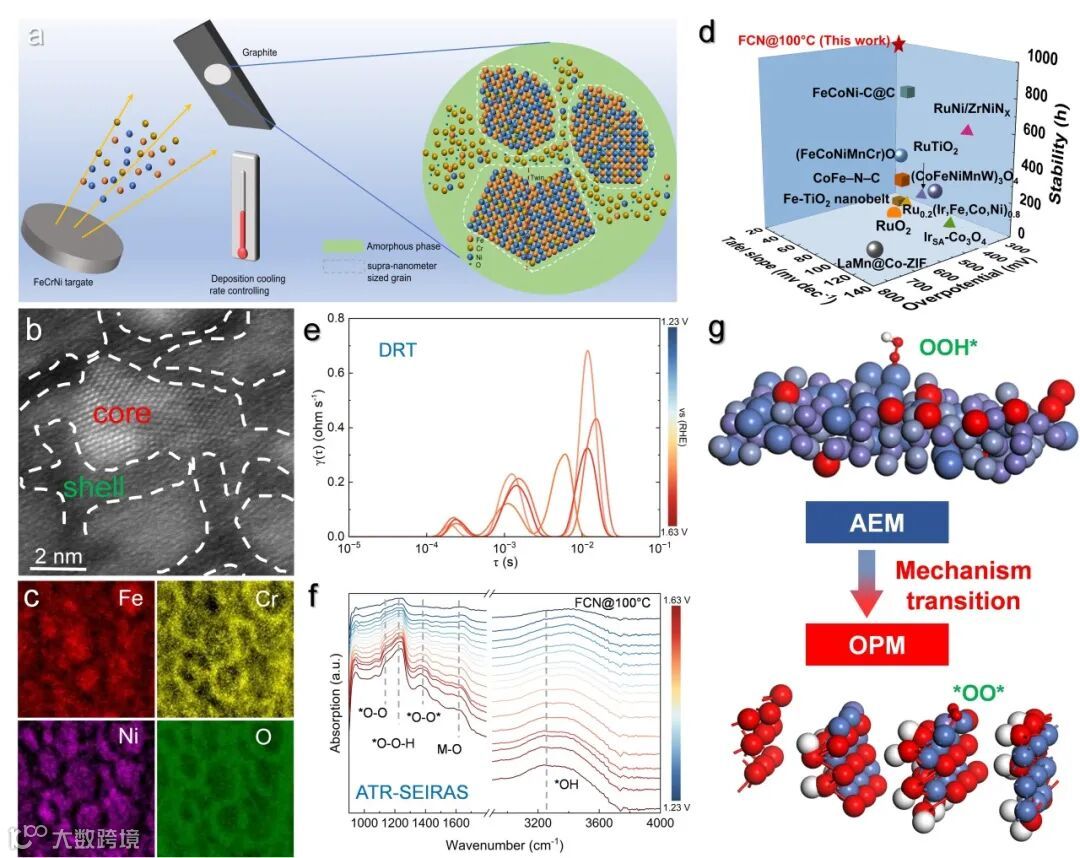 为探究其性能提升的内在原因,团队运用了弛豫时间分布分析、原位拉曼光谱、原位红外光谱、同位素标记质谱等一系列先进的原位表征技术。研究发现,这种独特的双相结构促进了关键FeNiOOH中间体的原位生成,该中间体优化了电荷转移和吸附/脱附行为,并驱动反应机制从传统的吸附质演化机制(AEM)向动力学更优的氧化物路径机制(OPM)转变。密度泛函理论计算进一步证实,FeNiOOH中间体能够稳定*O-O*物种,降低反应能垒,使得氧化物路径机制得以高效进行。理论计算还表明,晶态/非晶态双相结构具有更低的功函数,更有利于电子激发和含氧中间体的形成。