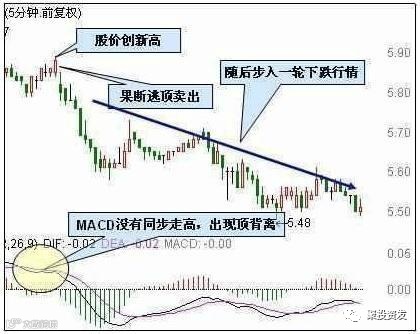 6、5分钟MACD顶背离。股价创新高时,MACD没有创新高,MACD出现顶背离。这说明短期趋势在走弱,主力资金在逐步撤离,一旦出货目的达到,股价很可能在当日反转向下,投资者应逢高减持,一旦股价反转则清仓出局。