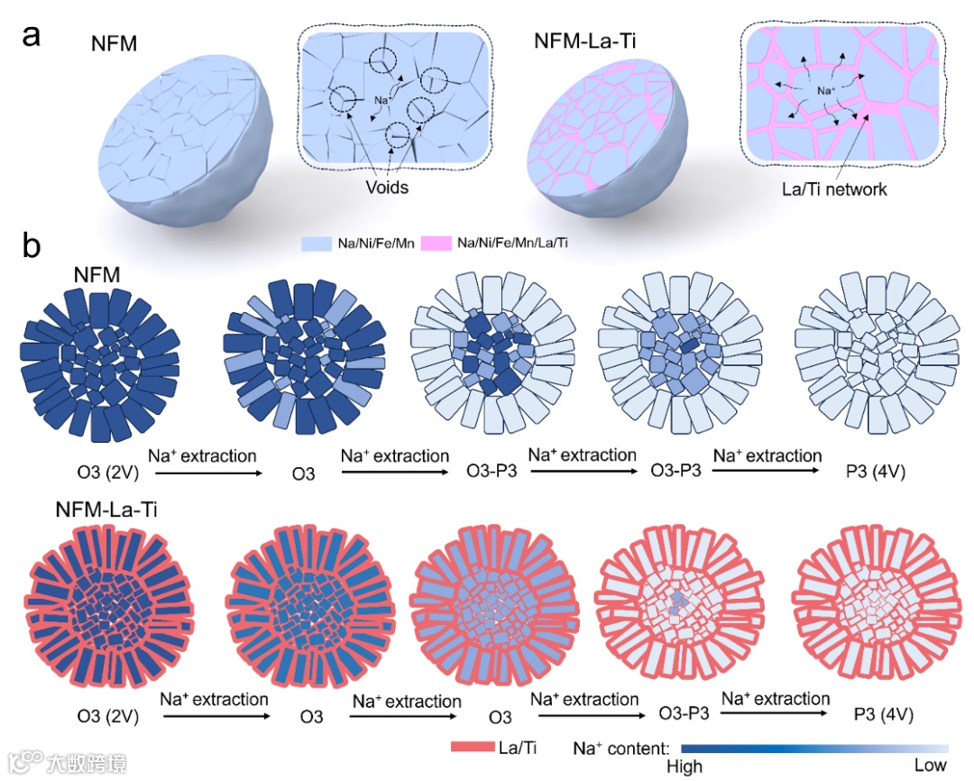 要点二:La/Ti 连通网络构建贯通Na+传导通路,促进 O3→P3 相变同步并缓冲化学–力学耦合应力