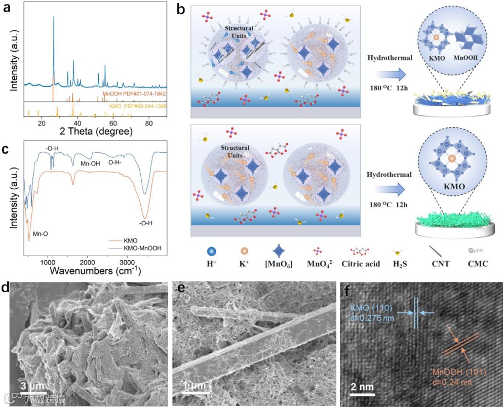 图1. KMO-MnOOH 复合材料的物相结构、生长机理与微观形貌表征。