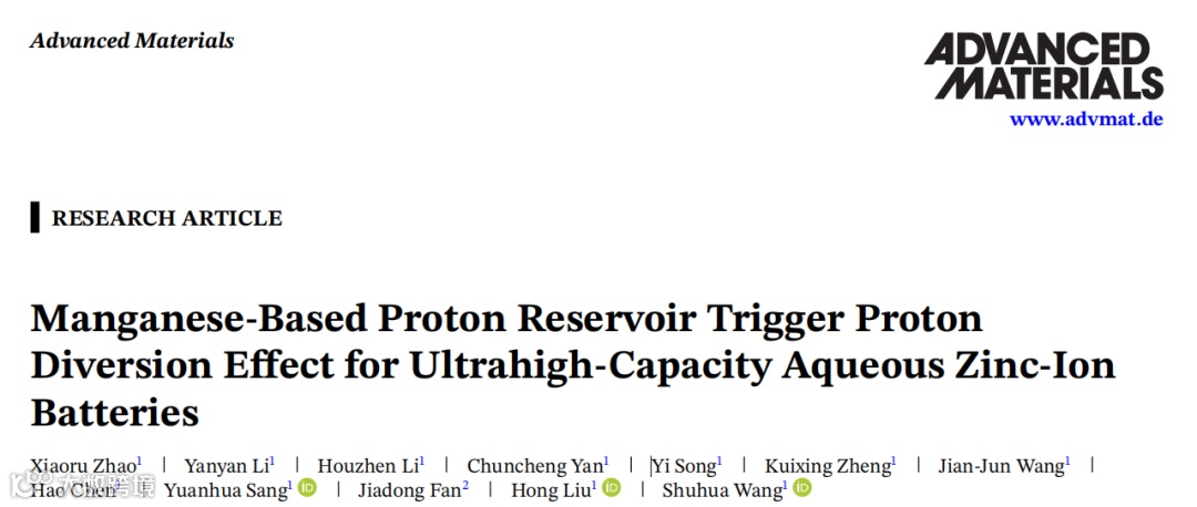 近日,山东大学王书华教授、刘宏教授、桑元华教授、上海科技大学范家东研究员在《Advanced Materials》上发表了题为“Manganese‑Based Proton Reservoir Trigger Proton Diversion Effect for Ultrahigh‑Capacity Aqueous Zinc‑Ion Batteries”的研究论文,提出了一种基于质子分流效应的创新策略,通过设计K⁺掺杂α-MnO₂与MnOOH的复合正极(KMO-MnOOH),调控了H⁺与Zn²⁺的嵌入行为,该正极展现出超高比容量(在0.3A g⁻¹下为645.6mA h g⁻¹)和优异的循环稳定性(在2A g⁻¹下循环950次后为239.3mA h g⁻¹)。