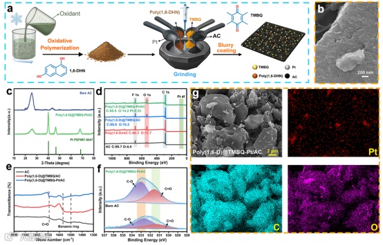 图1. a) 聚合物合成到正极制备的工艺流程示意图; b) poly(1,6-D)@TMBQ-Pt/AC正极表面高倍SEM图像; c) 纯AC正极与poly(1,6-D)@TMBQ-Pt/AC正极的XRD图谱; d) 纯AC、poly(1,6-D)/AC、poly(1,6-D)@TMBQ/AC及poly(1,6-D)@TMBQ-Pt/AC正极的XPS全谱; g) poly(1,6-D)@TMBQ-Pt/AC正极的低倍SEM图像及对应的Pt、C、O元素分布EDS图; e) AC、poly(1,6-D)@TMBQ/AC及poly(1,6-D)@TMBQ-Pt/AC正极的FTIR图; f) AC与poly(1,6-D)@TMBQ-Pt/AC正极的高分辨C 1s XPS图谱。